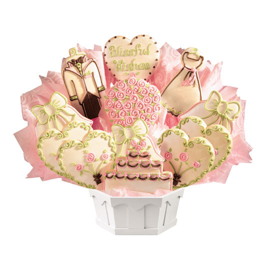 Create a lasting impression when you use this unique wedding bouquet as a gift for the new couple or as an edible table centerpiece for bridal showers, bridesmaid luncheons, or wedding receptions. Artfully hand-decorated in pearl, pink, spring green and a hint of brown, this beautiful wedding bouquet is sure to create a lasting impression for years to come.