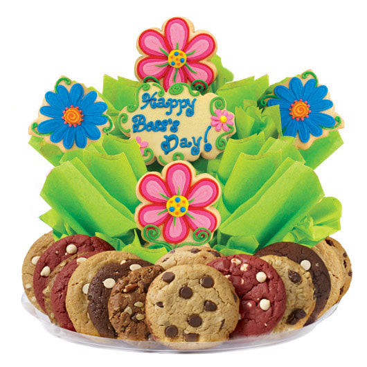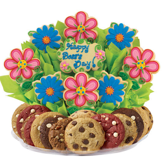 Express your appreciation with an exceptional gift for Boss Day that'll surely impress your boss! This blooming gift basket of flowers is surrounded by a delectable array of gourmet cookies that will stand out on any desk full of Boss Day gifts!