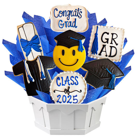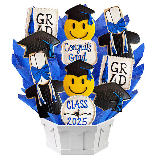 Time to celebrate your Graduate! Customize our new Celebrate Your Grad bouquet design with their school colors and your personal message. This design dynamic design includes Cap, Gown and Diploma. Each sugar cookie is freshly baked and expertly hand decorated with our signature icing.