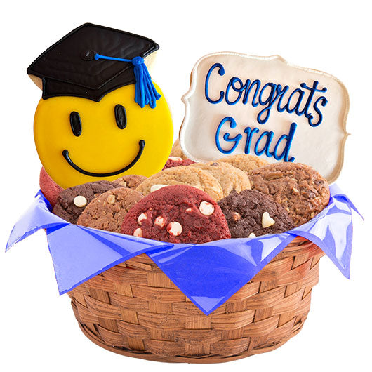 Celebrate the Graduate in your life! Your two decorated cookie basket contains one delicious Emoji Graduate with your choice of tassel color, and your custom message cookie along with your choice of one or two dozen of our made from scratch, fresh baked Gourmet Cookies.