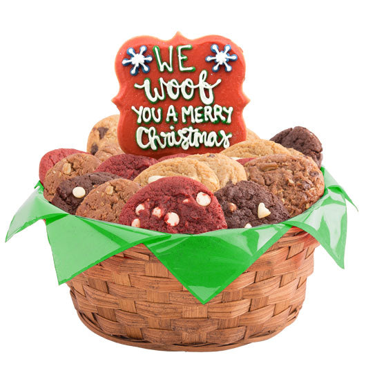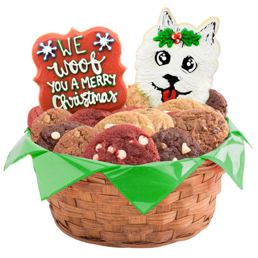 “We ‘WOOF’ you a Merry Christmas!” Perfect for a surprise holiday delivery, this gift basket includes a choice of one or two hand decorated dog themed cookies, nestled into a basket of one or two dozen gourmet cookies. Each sugar cookie is freshly baked and perfectly decorated with our signature icing, ideal for sharing the holiday love. The perfect Christmas gift for any dog lover! This basket serves as a thoughtful and unique dog-related gift which is sure to make their day. Get ahead of the chaos and order early to help reduce the stress of gift-buying around Christmas time.