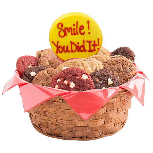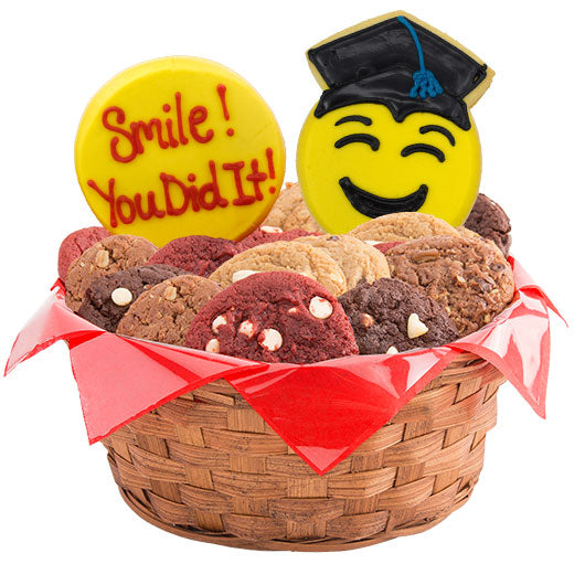 You did it! Celebrate the Class of 2025 with a cookie bouquet of cheerful emojis. Send some love and a smile to help commemorate this exceptional milestone! This gift basket includes a choice of one or two hand decorated sugar cookies, nestled into a basket of one or two dozen gourmet cookies. Each sugar cookie is freshly baked and perfectly decorated with our signature icing and can be delivered safely to their doorstep. *To personalize this gift with your school colors, call 1-844-998-2789.