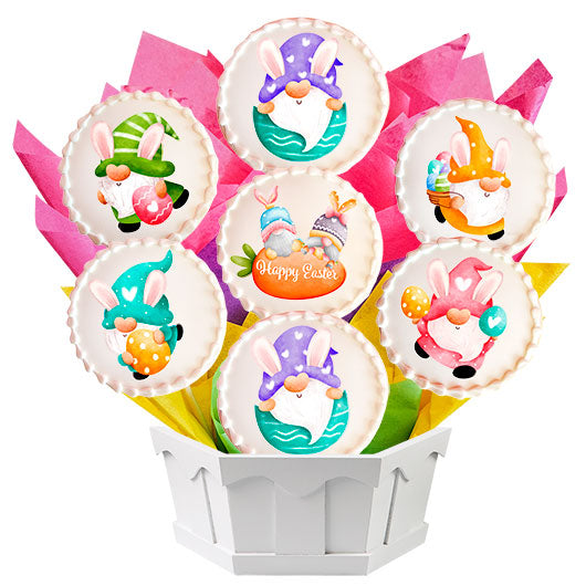 A Fun - Gnominal Easter treat. Each Easter Gnome sugar cookie is freshly baked and glazed with our signature icing then topped with a fun Easter Gnome edible image, assured to create smiles! Available for local shop pick up or Local and Nationwide delivery.