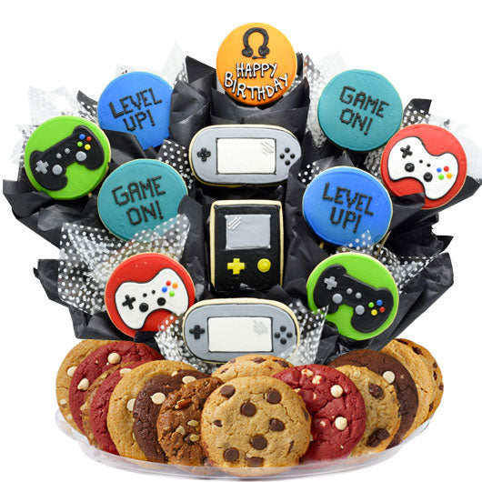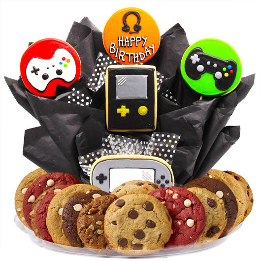 Treat your favorite video game enthusiast to a gift they will happily pause their game for. Fresh baked gourmet cookies surround the fun bouquet of video game decorated cookies and makes for a tasty way to say Happy Birthday or change the message to match their special occasion. A delicious gift for gamers that can be delivered right to their doorstep!