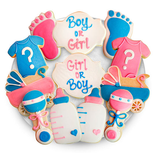 Enjoy a delicious debate- is it a Boy or is it a Girl. Each Gender Reveal Favor Cookie Tray hosts a dozen traditional pink and blue baby favor cookie designs including Baby Bottles, Rattles, Carriages, Baby Feet and Onesies along with the all-important question “Is it a Boy or a Girl”. Every favor size sugar cookie is freshly baked and expertly hand decorated with our signature icing.