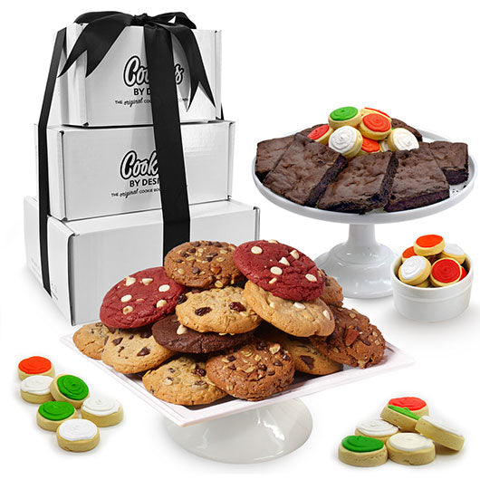 Gift the perfect sweet combo! Our new Gift Tower Box brings together all the favorites into a perfectly ribbon-wrapped package. Tower includes two dozen assorted gourmet cookies, 9 brownies, and two dozen sweet spots!