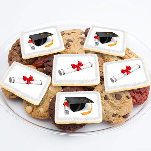 t’s Party Time! Send the celebration to your Graduate with our new Graduation Party Cookie Tray featuring six favor size sugar cookies iced and decorated with cap and diploma edible images and a dozen of our amazing gourmets!