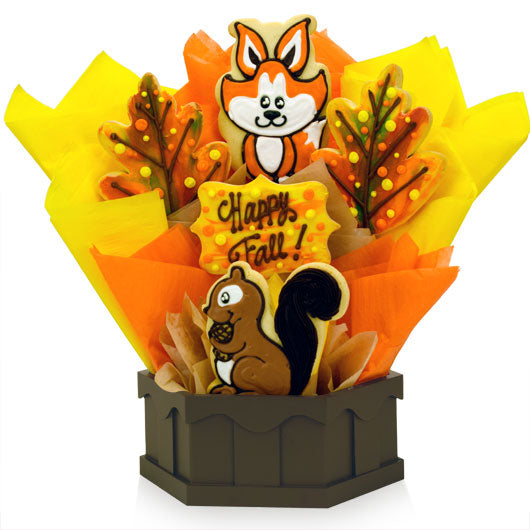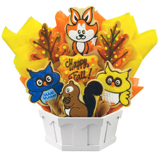 Celebrate the season change with an adorable woodland animals fall bouquet. Each sugar cookie is fresh baked and hand decorated in all the colors of autumn and is the perfect addition to a fall festival, woodlands themed baby shower or birthday party.