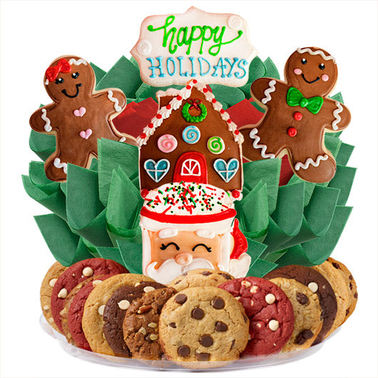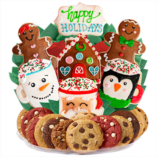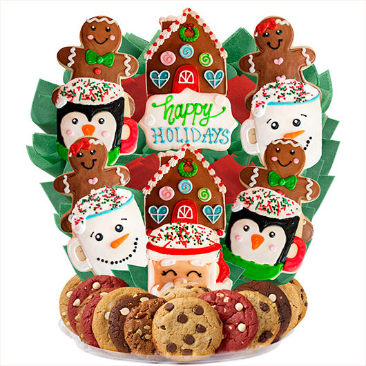 Fill their home with a fantastically decorated Happy Holiday Mugs design surrounded by freshly baked seasonal gourmet cookies. Santa, Snowmen, Snowman, Penguins, Gingerbread Cottage, Gingerbread Boys and Gingerbread Girls make this a whimsical treat. Each sugar cookie is freshly baked and expertly hand decorated with our signature icing, then arranged in a bouquet, and surrounded by one or two dozen made from scratch gourmet cookies. Have this BouTray™ delivered to their doorstep!