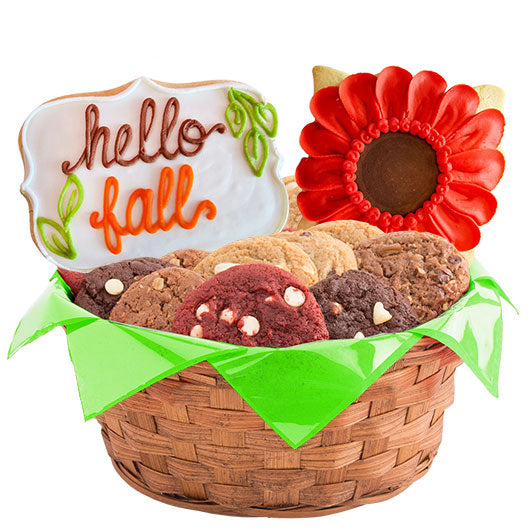Send a warmth and vibrant Hello Fall cookie basket. Each basket contains your choice of one or two expertly hand decorated sugar cookies and your choice of one or two dozen of our made from scratch, fresh baked Gourmet Cookies.