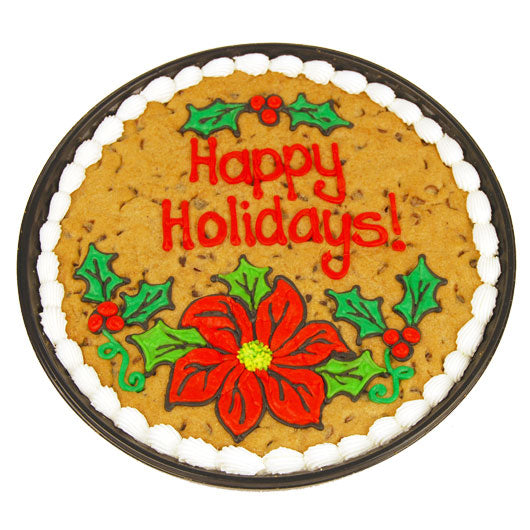 Show the beauty of the season with this festive holiday cookie cake. This delicious chocolate chip cookie cake decorated with holiday flowers is sure to arrive in bloom for a perfect holiday display.