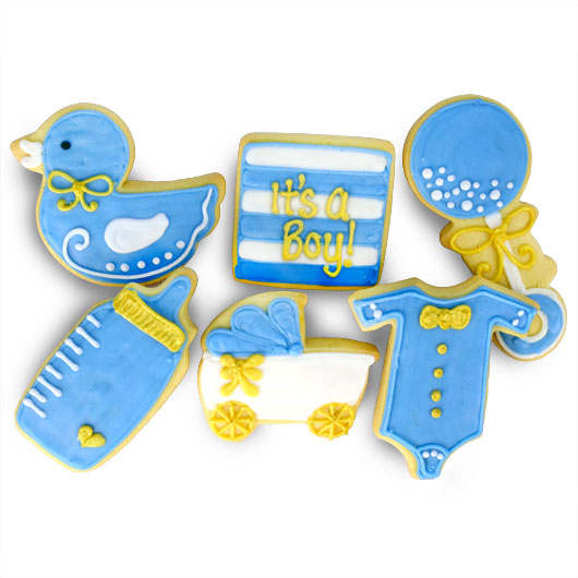 It’s a Boy! Celebrate the new arrival with Cookies! Each of these favor-sized sugar cookies is hand decorated with blue and white icing with gold accents, perfect for baby shower favors or announcements. Minimum 12 cookies per order.