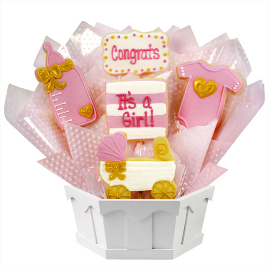 The perfect baby shower gift is a delivery of our new It’s a Girl bouquet. The new parents will be delighted to receive these hand decorated sugar cookies in pink and white with gold accents, it almost looks too good to eat!