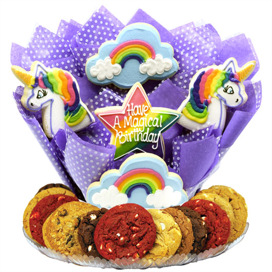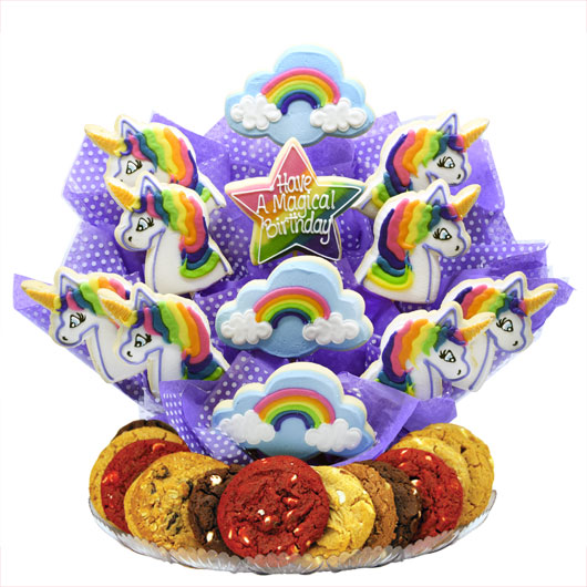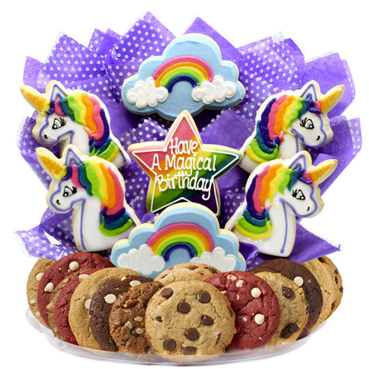 Magic is in the air with our new Magical Unicorn Gift. Surrounded by an assortment of gourmet cookies are an array of rainbow and unicorn decorated cookies that will WOW any fan. Customize the message cookie to create a gift for any occasion!