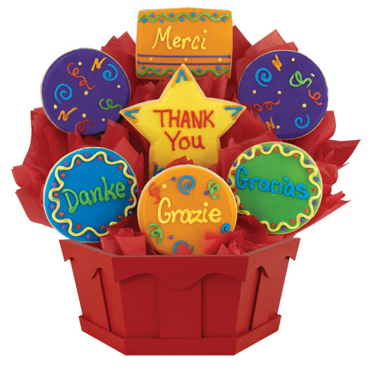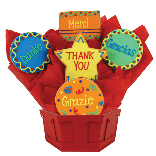 Merci, Gracias, Danke, Grazie! Send these brightly coloured iced cookies expertly arranged in a bouquet as a way to impress and show your appreciation. Nothing says "thanks" in more ways than this unique thank you gift.