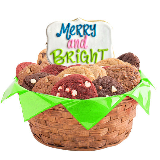 ‘Tis the season to be Merry & Bright. Treat someone special to a Christmas cookie basket that will brighten their holiday and tempt their taste buds! Nestled in an assortment of gourmet cookies are either one or two hand decorated sugar cookies that are perfect for holiday celebrations or a special delivery to loved ones.