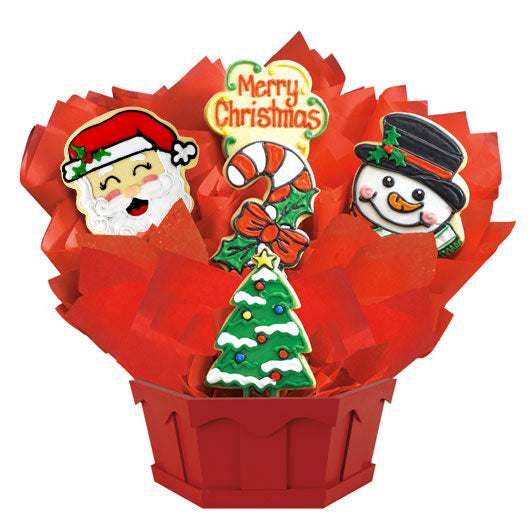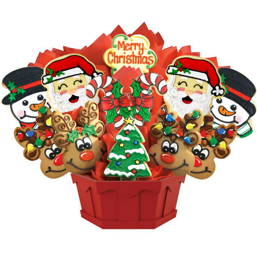 As one of our most popular Christmas bouquets, the Merry Christmas bouquet features traditional Christmas icons that are sure to bring smiles to all. With hand decorated Christmas sugar cookies, this unique and fun gift is a delicious way to send your holiday greetings!