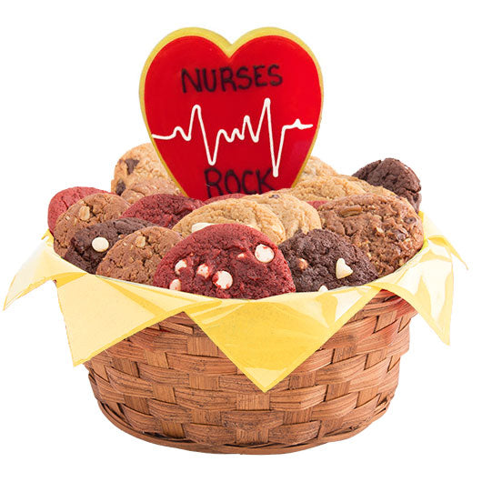 Acknowledge a nurse that holds a special place in your heart with a sweet treat of cookies! Our Nurses Rock basket is a delicious nurse appreciation gift or even a nursing school graduation gift. Filled with gourmet cookies and topped with hand decorated sugar cookies, they will savor this gift with each bite.