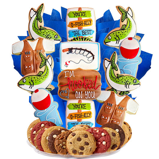 Hook the big one this year with our O-FISH-ALLY THE BEST design. This fun fishing design is the perfect celebration of the fisherman or fisherwoman in your life! This dynamic design includes Fish, Poles, Vest, Lures, and your personal message. Each sugar cookie is freshly baked and expertly hand decorated with our signature icing, then arranged in a bouquet, and surrounded by one or two dozen made from scratch gourmet cookies. Have this BouTray™ delivered to their doorstep!