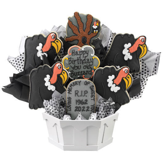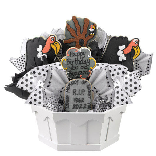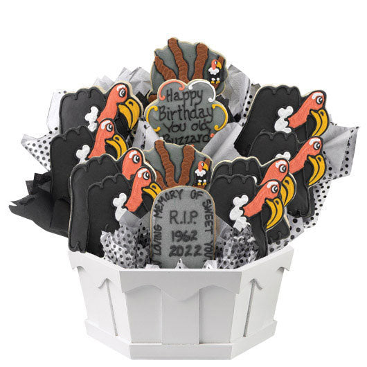 Make them laugh with this humorous "Old Buzzard" bouquet. The message cookie is surrounded by buzzards and a gravestone which can be personalized for your friend or loved one's special day!