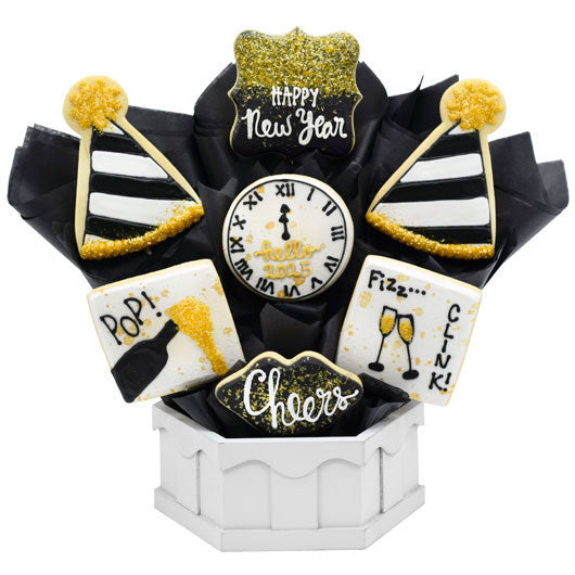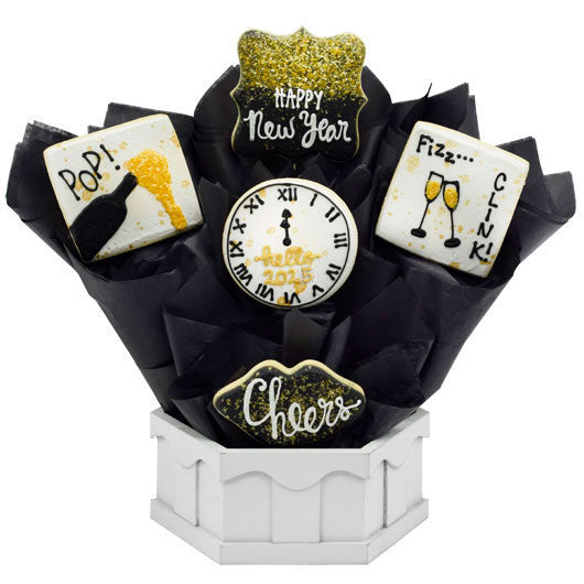 Pop, Fizz, Clink! Ring in the New Year with a dazzling New Year’s Eve bouquet that will wow party guests. Each of these cookies are baked fresh to order, decorated by hand with our velvet smooth signature icing, and accented with edible gold flakes to make it glitter. Perfect for your New Year’s Eve celebration or morning after brunch where everyone will be saying cheers with each bite.