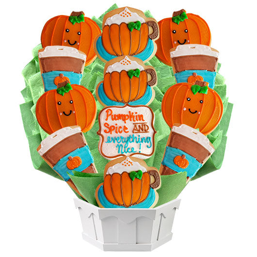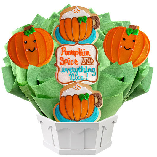 “Pumpkin Spice and Everything Nice” is the perfect welcome for the colorful Fall season. Pumpkin Spice has become synonymous with the arrival of cooler fall temps and this new design featuring bright orange pumpkins and warm frothy lattes is guaranteed to provide a warm hug to every recipient. Each sugar cookie is freshly baked and expertly hand decorated with our signature icing.