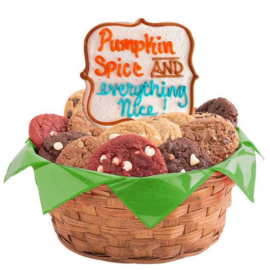 “Pumpkin Spice and Everything Nice” is the perfect welcome for the colorful Fall season. This gift basket includes a choice of one or two hand decorated sugar cookies, nestled into a basket of one or two dozen gourmet cookies. Each sugar cookie is freshly baked and perfectly decorated with our signature icing; each gourmet is baked fresh with the finest ingredients. Delivered safely to their doorstep.