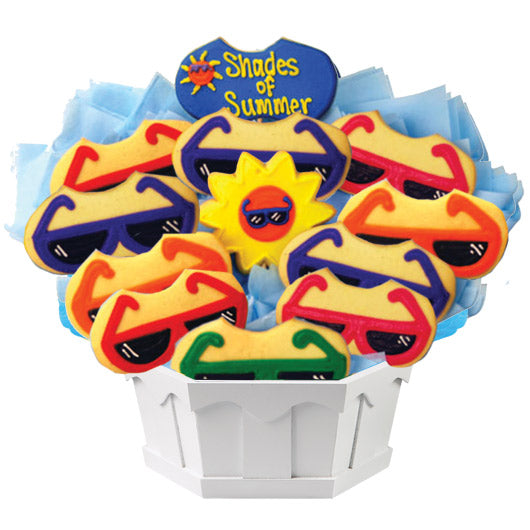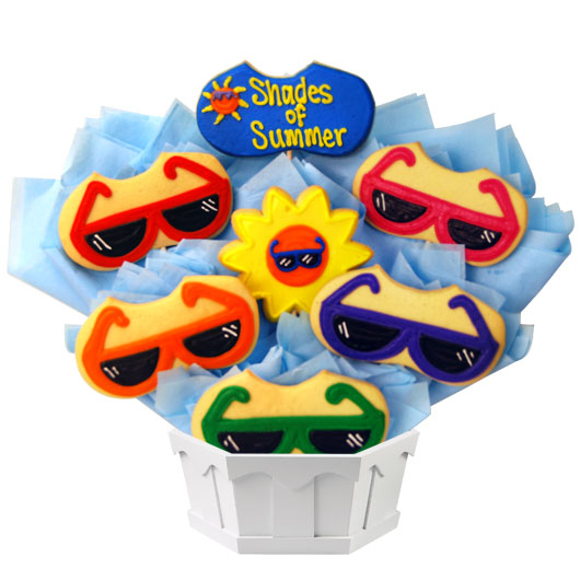 Stay cool this summer! This “Shades of Summer” bouquet is the perfect fun & colorful gift for summer celebrations. Featuring hand-decorated sun & sunglasses cookies, this summer gift is sure to brighten someone’s day.