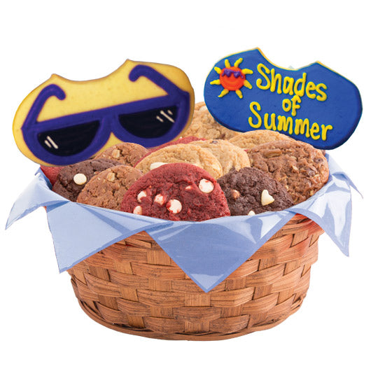 Stay cool this summer! This “Shades of Summer” cookie gift is the perfect fun and colorful gift for summer celebrations. Nestled in a basket of gourmet cookies are a hand-decorated sunglasses cookie and/or a message cookie. This summer gift is certain to brighten someone’s day.
