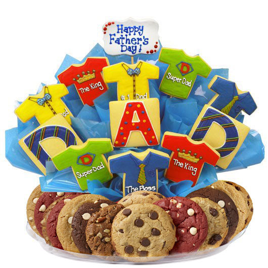 Not your typical shirts for dad! This incredible cookie arrangement features hand decorated sugar cookie “shirts”, each describing the awesome man that he is! Treat him to something different this year with a cookie gift that is unlike anything he has received before. Surrounded by an assortment of his favorite gourmet cookies, this is a gift you’ll hope he shares!