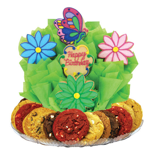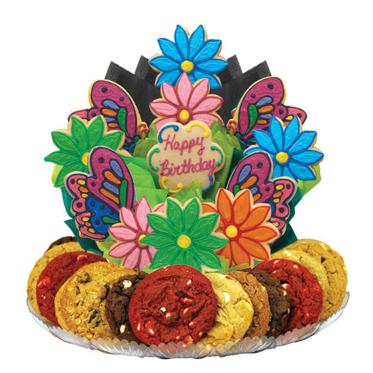 Her heart will flutter when you give this beautifully hand-decorated butterfly and daisy bouquet to the special lady in your life. Combining stunning design and heavenly gourmet cookies our BouTray’s™ make delightful birthday gift baskets for women that are the perfect addition to her celebration.