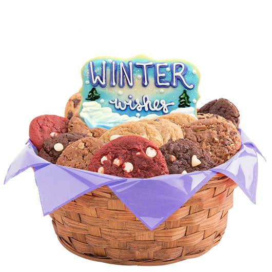 Snow is falling! Create your very own winter wonderland with this stunning cookie basket. This gift features the choice of one or two freshly baked, individually hand-decorated sugar cookies carefully nestled into a selection of either one or two dozen of our gorgeous gourmet cookies. In its entirety, this arrangement will be the perfect addition to any wintery event or be a perfectly unique gift for someone special!