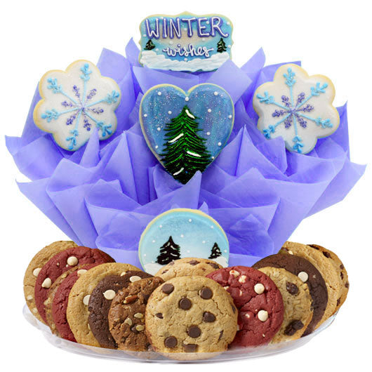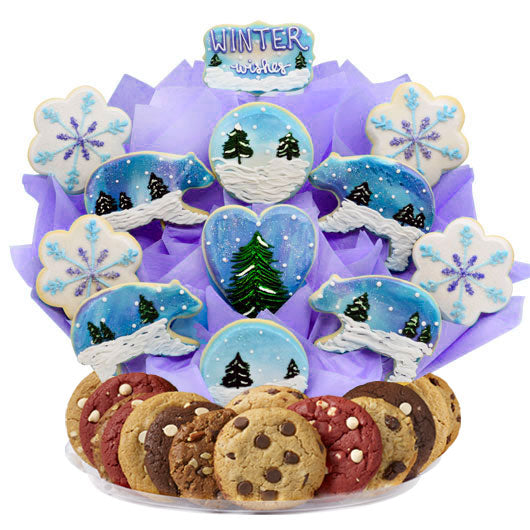 This gift of a beautiful snowy landscape finished with a stunning glitter dusting adds a touch of magic to any winter celebration. Create your very own winter wonderland with this stunning cookie Boutray, a perfectly delicious centerpiece sure to warm up the taste buds. These hand-decorated sugar cookies would be the perfect addition to any winter event, unique and delicate just like a snowflake. The sugar cookies in this arrangement feature a stunning winter forest landscape, majestic polar bears and elegant snowflakes with the option of customizing your own message on the “Winter Wishes” cookie. Surrounding this scenic bouquet features a selection of our finest gourmet cookies, sure to sweeten any winter occasion and leave the recipient in awe.